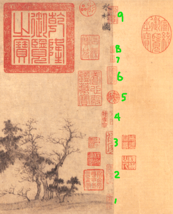 康熙二十四年(乙丑,1685)三月,纳兰携《水村图》请朱彝尊题签(《曝书亭集》卷五十四《题赵子昂水村图》。所言之“签”,可能即引首也),今卷内未见朱氏字迹,前引首为乾隆所书“清华”二大字矣。至于该卷此前有无引首,因记载阙如,已不可考。而乾隆帝所题之引首字,只是补裱在卷首(或即是将朱彝尊之引首抽换了也),自前隔水至附隔水处,俱未变更。但附隔水(25)“汉阳吴氏藏书画印记”、(26)“楞伽”两压缝章中间也有残损,是知在乾隆时代,至少有过首尾的局部揭裱重装;今卷前隔水⑼“御赏”、后隔水(21)“乾隆御赏之宝”两印,是为最后所钤之压缝章也。