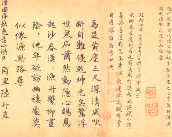 近人金梁《盛京故宫书画录》第六册著录有“宋元明人书册”一件,素笺本,内收赵孟頫、邓文原、张羽、徐贲、王行、谢晋、陈则、文徵明八人诗笺,邓氏诗句同《珊瑚木难》著录。谓该笺“高六寸五分,广二寸二分”,较《水村图》之“高七寸六分”略小;该册其他七人笺最高者为谢晋,五言十二句,“高六寸四分,广二寸九分”,与邓氏诗高、宽比例相仿佛。该册每页均钤“安仪珍藏”印,则曾经安歧鉴藏。