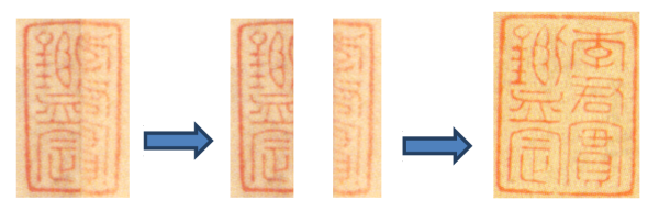 ⑥前隔水有⑺、⑻两枚压缝章,《石渠宝笈》释作“敬美”,甚是。盖此二印在第五次揭裱重装时,因裁切再拼接造成中间残损;左右合并后,笔画缺漏,若不作详细比对,实无从释读。今细审之,⑺、⑻当系连珠印,经先拆开,以印面左右一边之宽度,留出上下边残损之空间,确定四边之位置,再依两侧笔画以补之,确为“敬”、“美”二字。且其残损篇幅与⑹“李君实鉴定”相同,则皆是下一次揭裱重装所致。