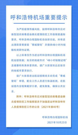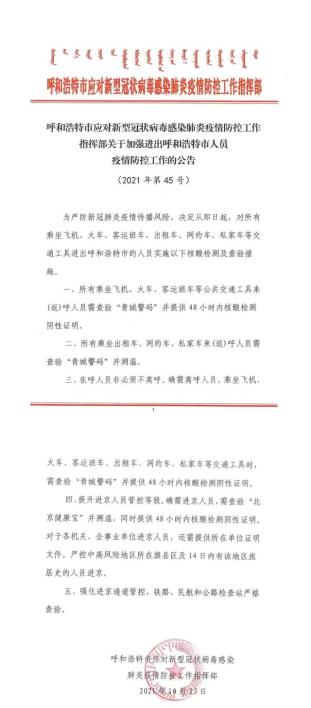 为严防新冠肺炎疫情传播风险,按照呼和浩特市应对新型冠状病毒感染肺炎疫情防控指挥部要求,从即日起,呼和浩特站、呼和浩特东站所有进出站旅客需查验“青城警码”并提供48小时内核酸检测阴性证明。