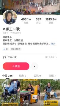 拥有463万粉丝的手工达人“手工耿”。/ 快手也有散布在西部少数民族聚居区的社区成员,如四川稻城以挖虫草和松茸为主要生计来源的藏族妇女“迷藏卓玛”(格绒卓姆)、贵州黔东南一个偏远山村的侗族女汉子“爱笑的雪莉”(袁桂花),以及在快手平台上从事表演艺术的民间艺人,如甘肃环县皮影艺人魏宗富、陕北说书艺人“贰强”、河南戏班子班主等。