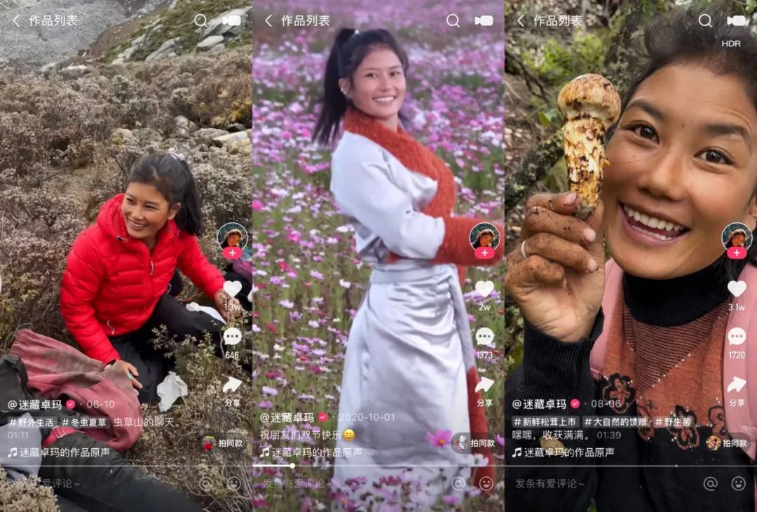 这个无形的生活“视界”,可以满足我们对所谓“原乡”生活的部分想象:在“迷藏卓玛”发布的众多短视频中,我们能够看到她所在的四川省稻城县贡色村的自然风光、村落环境以及家居内景、日常起居,同时也可以看到当地藏族村民的生活场景,如集体挖虫草、全家采松茸,以及互助建房、赛马会、转神山、新年娱乐等内容,从而描绘出一个以“迷藏卓玛”为主视点的地方生活图景。虽然这些是一种碎片化的景观,但是在一位活跃的本地女性出镜串联之下,仍然具有较强的文化感召力。