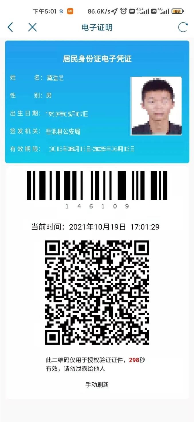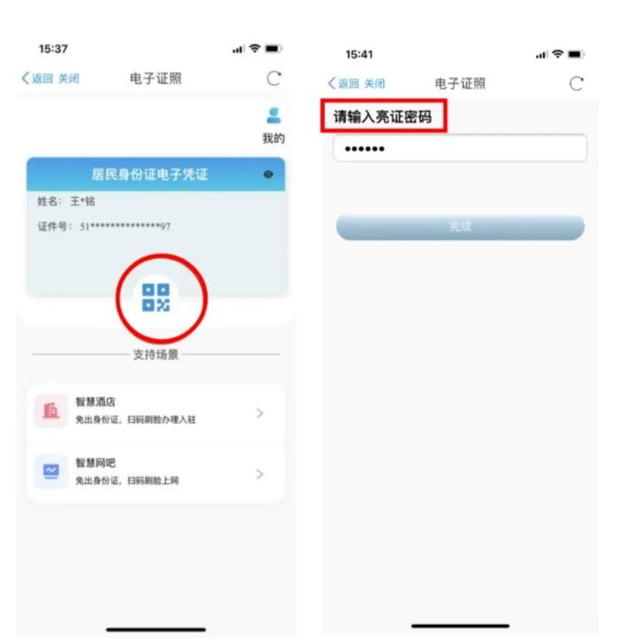 人脸识别完成后返回证照列表,选择认证完成的居民身份证;点击图中二维码,输入6位“亮证密码”即可实现“亮证”。