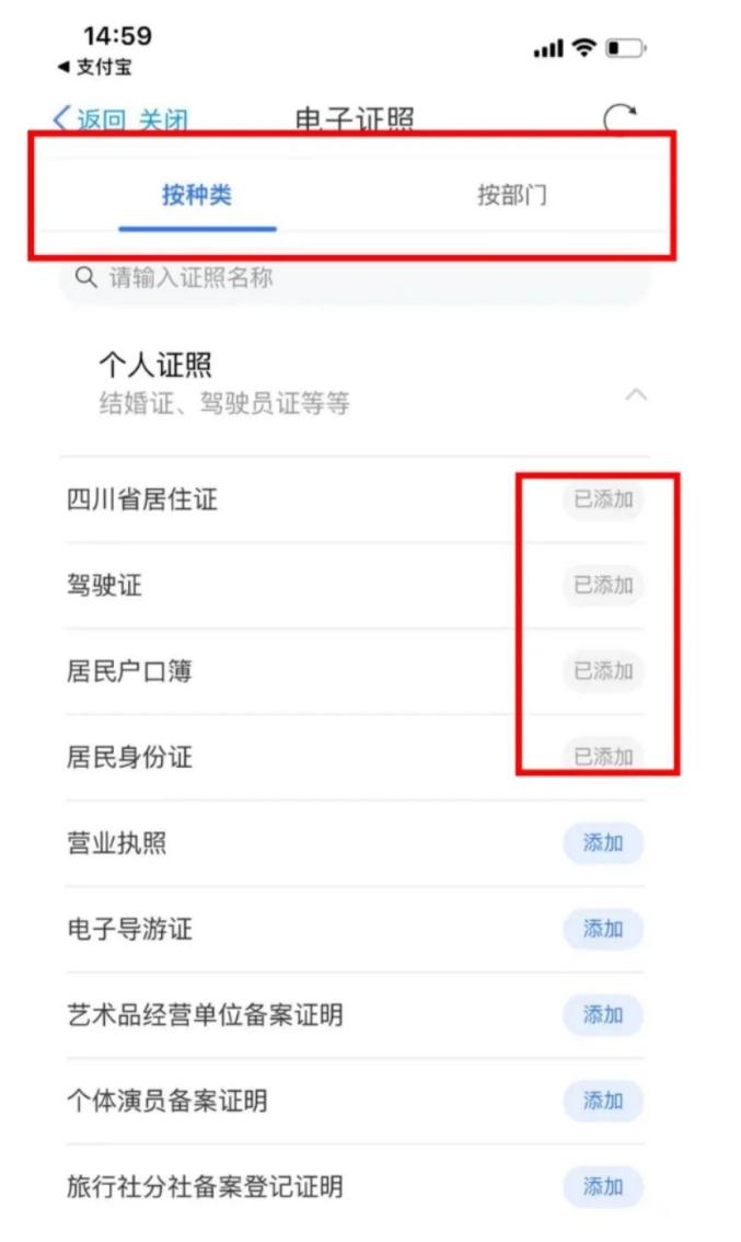 进入证照列表,“按种类”或“按部门”添加需要的证照。