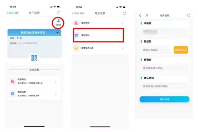 如何修改“亮证密码”、更新证照信息、查看证照使用记录?选择一个证照,进入电子证照页面,点“我的”;选择“修改密码”、“证照更新”、“查看使用记录”,按照提示进行操作。