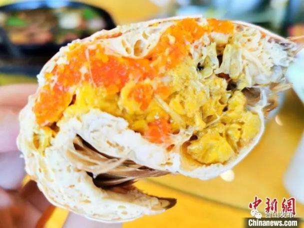 膏蟹里的膏层次分明 李晓春 摄台山海鲜市场中销售青蟹的摊档货源充足,摊主们忙着为顾客挑选、装袋、称重、打包……一只只生猛而肥美的青蟹,经蒸、焗、焖、煮等烹饪方式送上餐桌,成为台山人与家人团圆时分享的幸福美味。