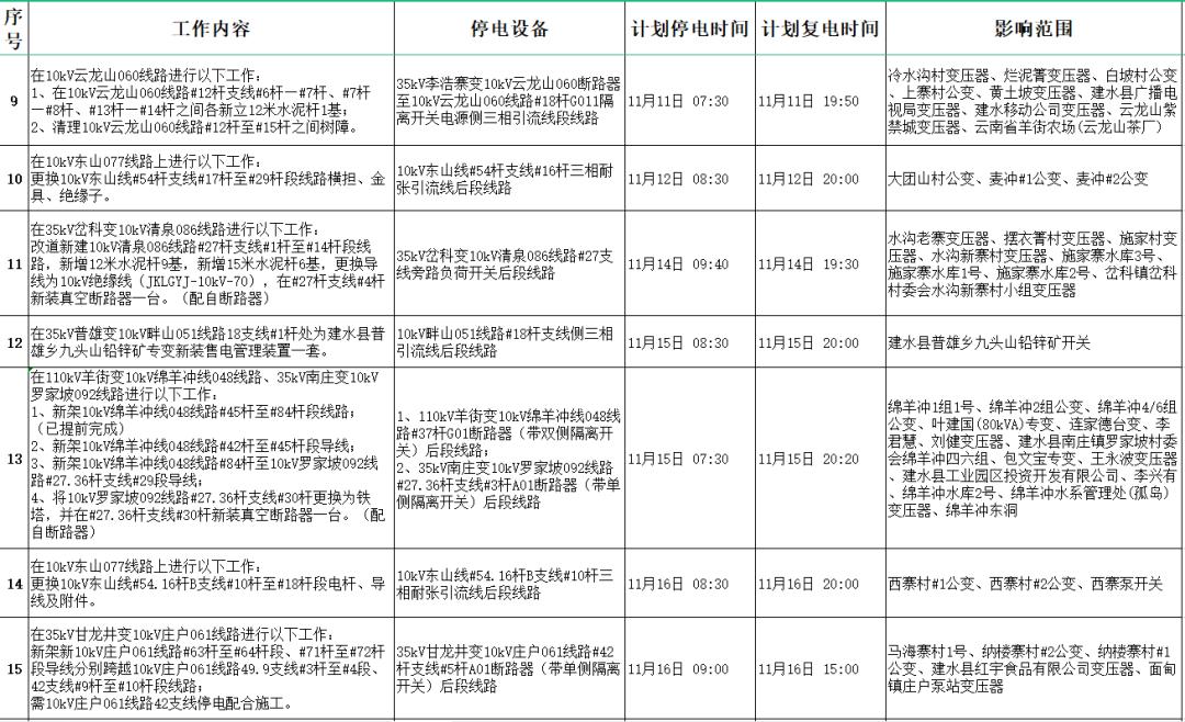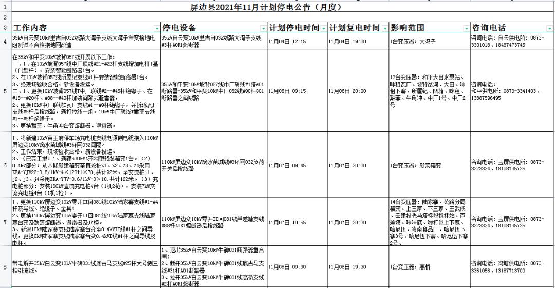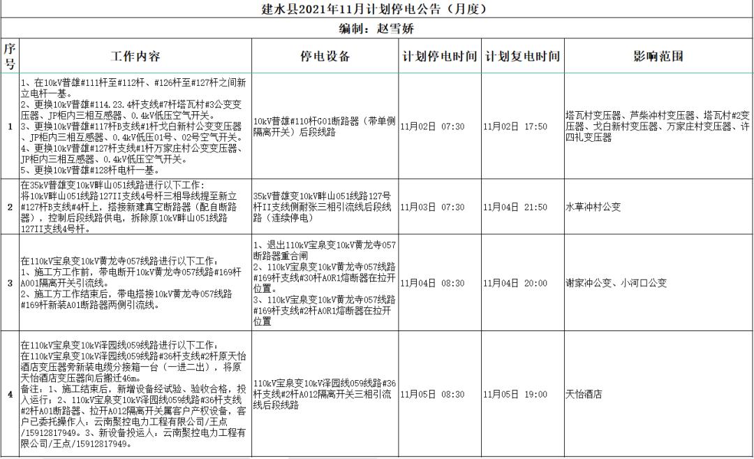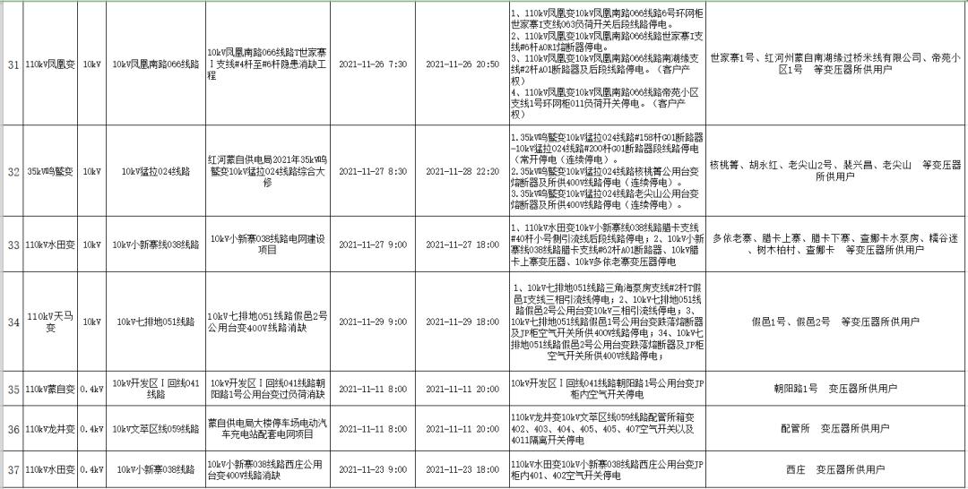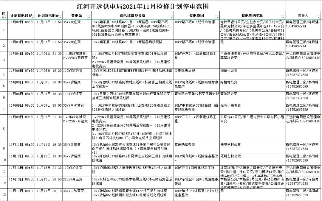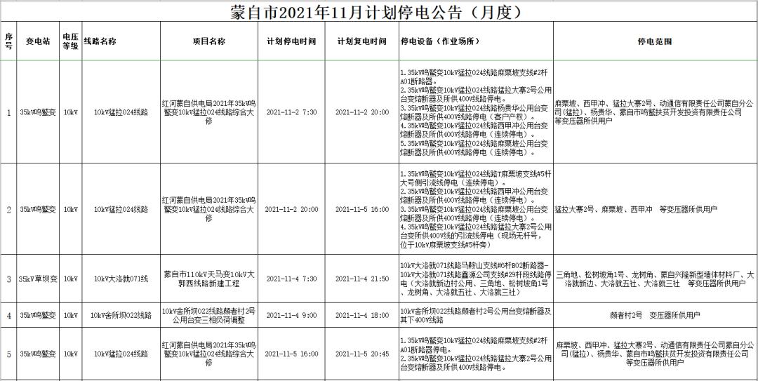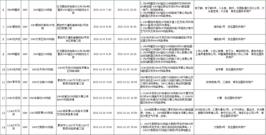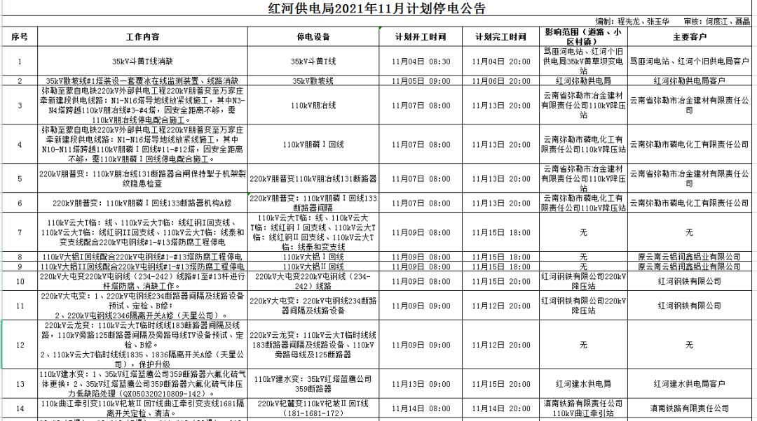 因电网检修需对以下线路进行停电,现将元阳县2021年11月01日-11月30日线路停电时间及停电范围公告如下: