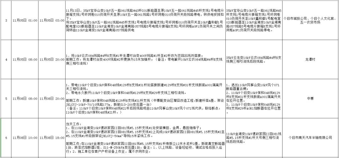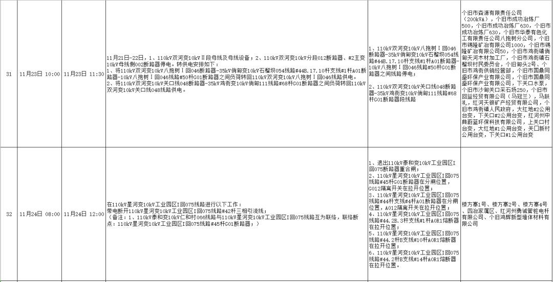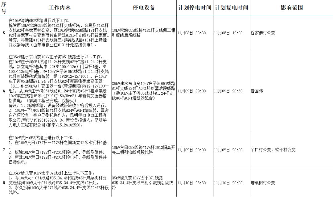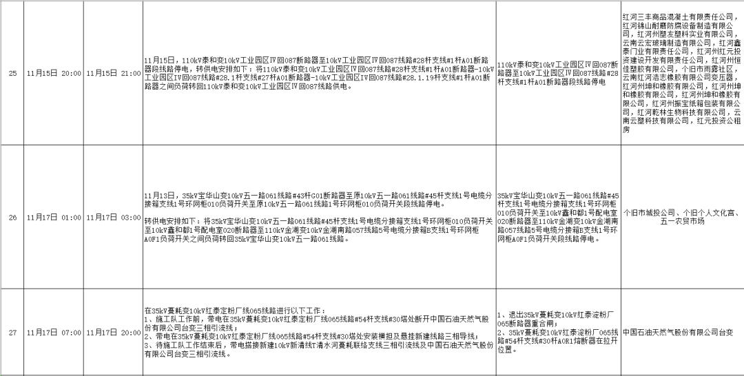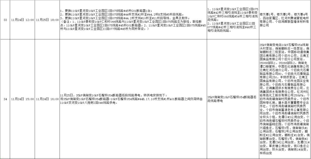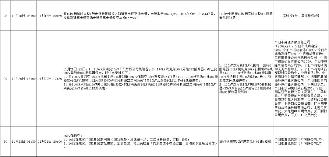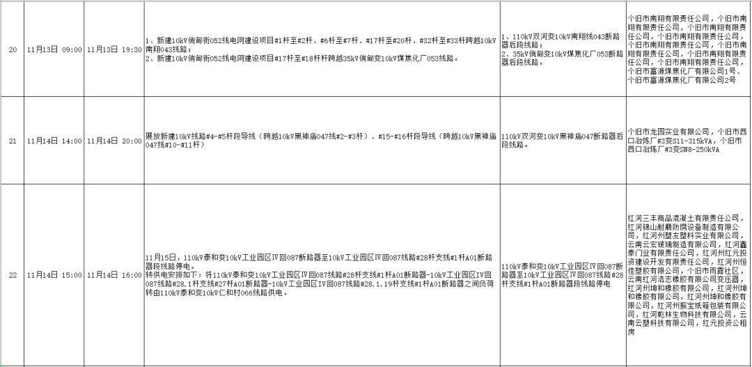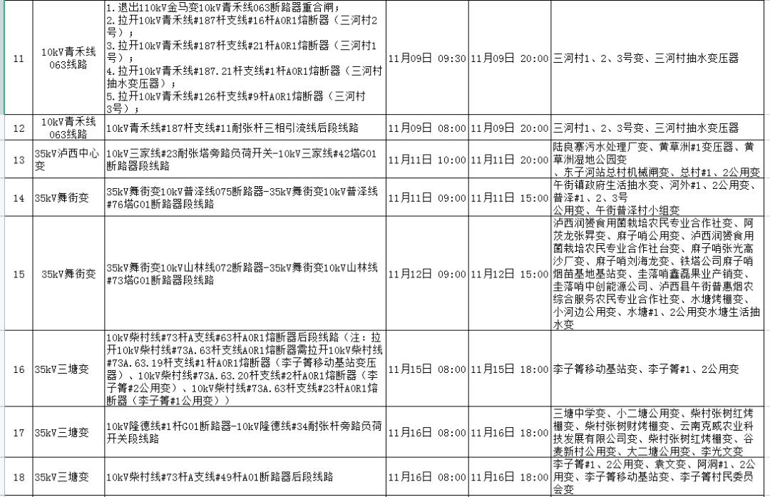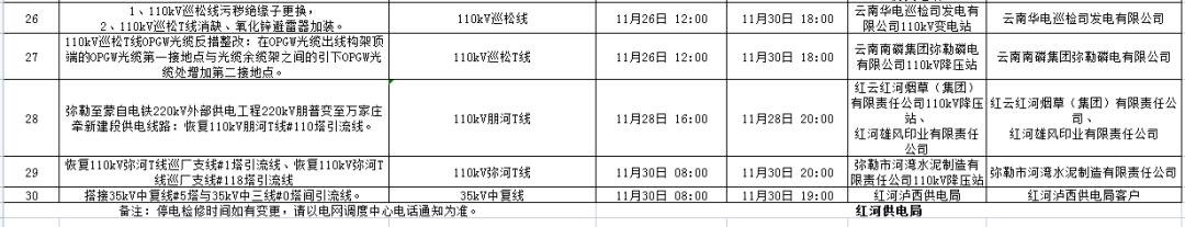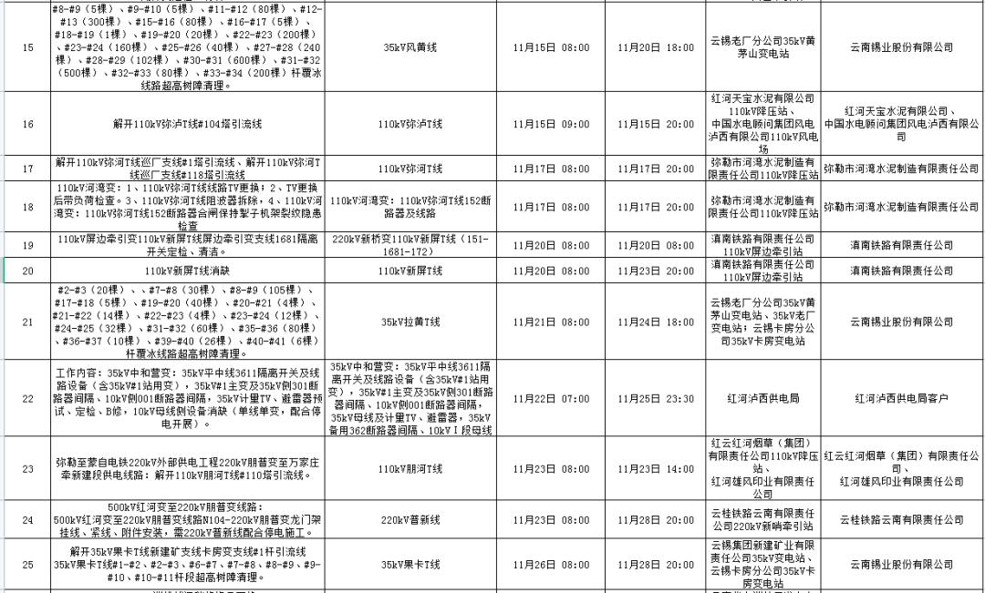 因电网检修需对以下线路进行停电,现将元阳县2021年11月01日-11月30日线路停电时间及停电范围公告如下: