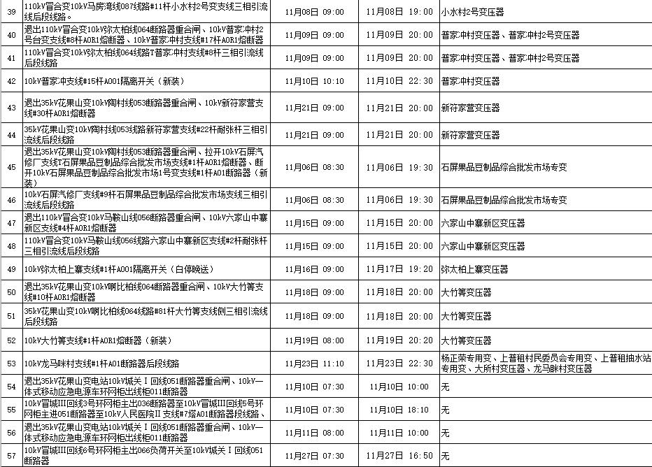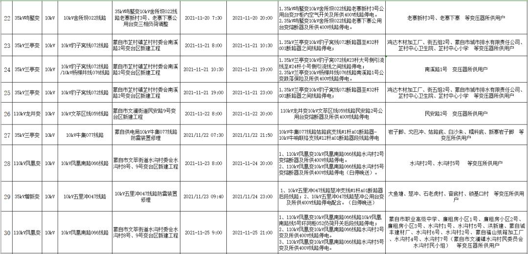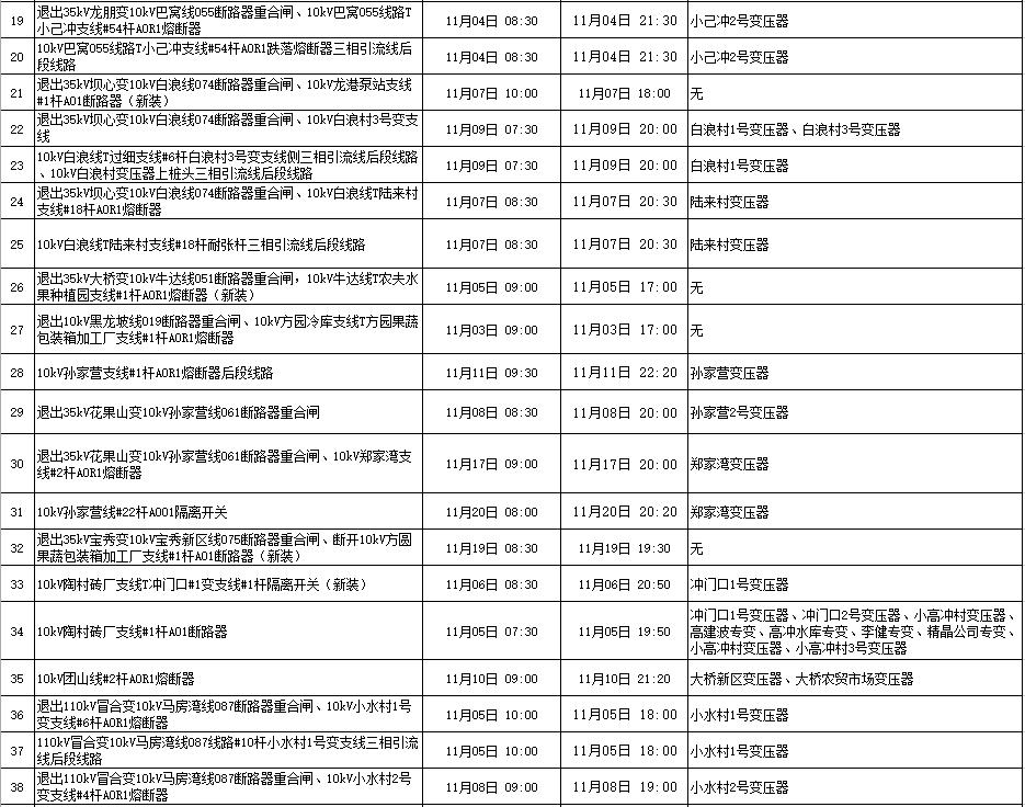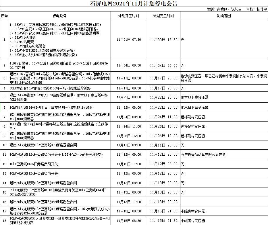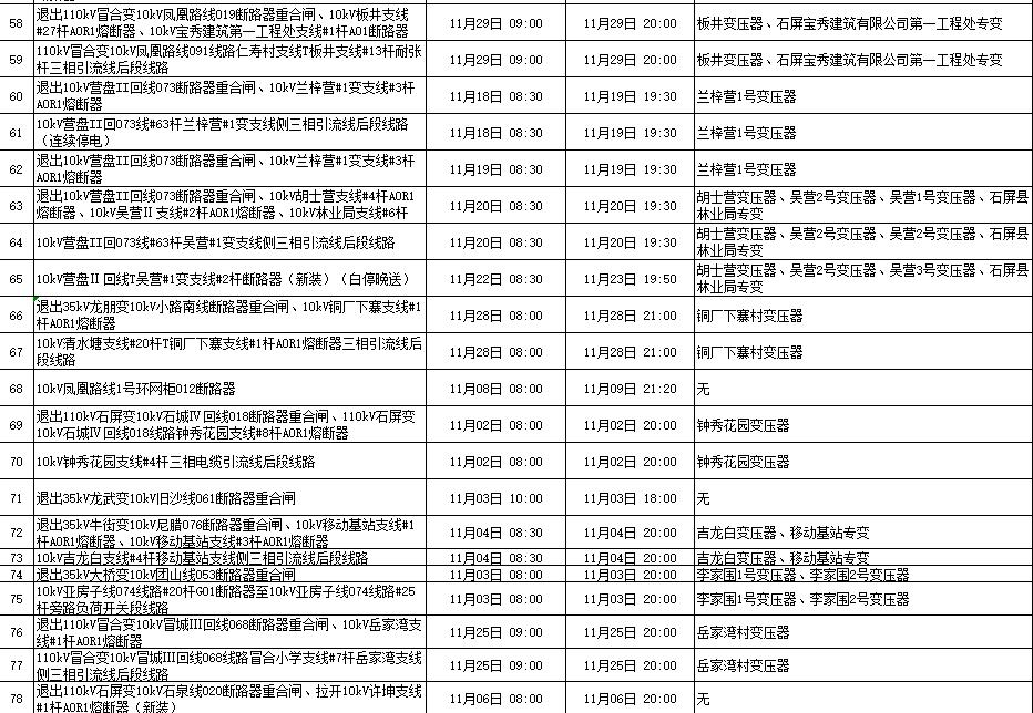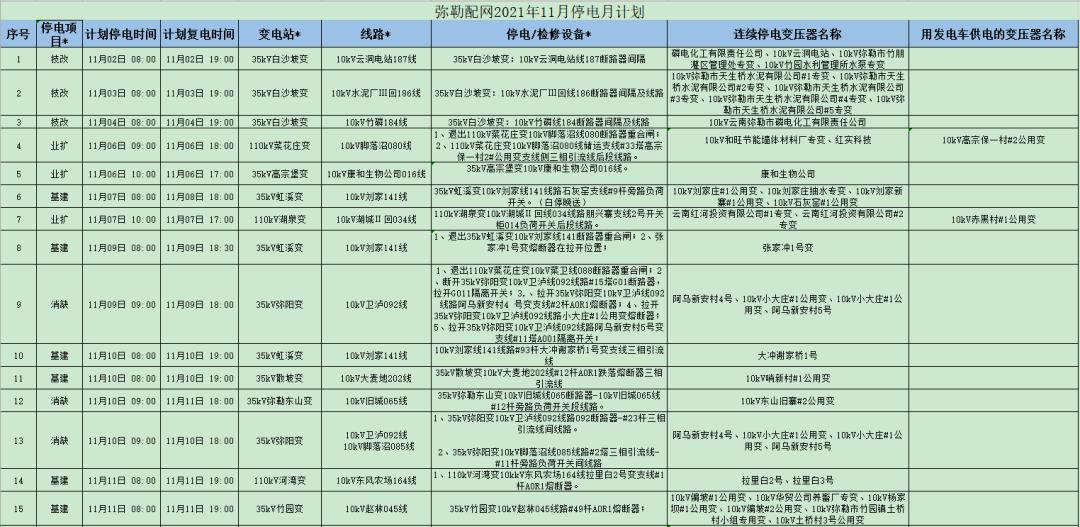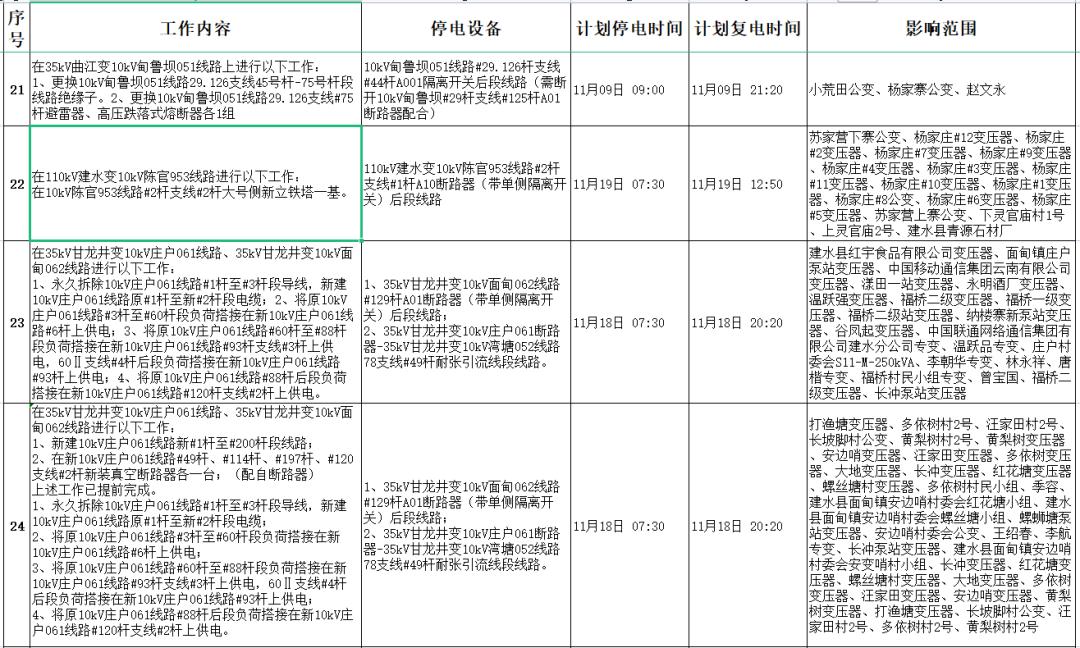 因电网检修需对以下线路进行停电,现将2021年11月计划停电时间及停电范围公告如下:
