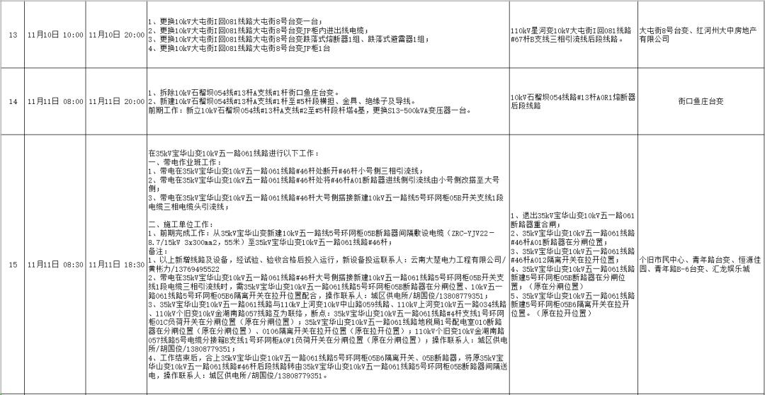 阿路嘎变、红土寨变、火烧寨变、昆湾变、太平寨变、志福村变、六蓬变、漫发变、那丙变、那丙变2号变、泰和装饰公司变、攀枝花变、攀枝花2号变、乌湾村变、乌湾街道变、乌湾新寨变、小坡脑变、淀粉厂1号专变、淀粉厂2号专变、淀粉厂3号专变、元绿高速土建三分部变、云南建投云铝高速土建二分部变、云南省建设投资控股集团有限变、昆车变、白安石料场1号变、元阳县白安石料场2号变、白安石料场1号变、元阳县兴源乌湾砂厂变、云南晶集科技公司变、云南晶集辣木开发有限公司变、安庄变、白安村变、太平寨变、太平寨矿山2号、卡娘变、七星寨变、田坝变、太平寨矿山3号变、太平寨矿山1号变、小昆浦变。咨询电话:南沙供电所:0873-55642864网格经理:马文祥(15825249192)。