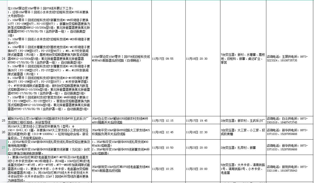 石灰窑4号变、标铺变、大马多倮2号变、大马多倮变、老凤港2号变、绞缅变、苦绿寨2号变、苦绿寨1号变、苦笋寨变、老凤港1号变、老凤港2号变、龙克村变、老凤港变、麻栗寨变、苗寨变、糯咱变、糯咱村2号变、石灰窑老寨变、石灰窑新村变、石灰窑新寨变、小马多倮变、新嘎娘变、青木里变、马鹿塘变、腾辉石业公司变、移动机站专变、元阳县嘎娘乡中心小学、中国电信股份有限公司元阳分公司变。咨询电话:南沙供电所:0873-5642864网格经理:李金明(13769385365)。