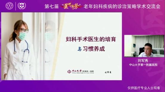 中国老年学和老年医学学会妇科分会青年委员会副主委、中山大学第一附属医院刘军秀教授首先对比了美国医生和中国医生的培训制度,讲解了如何成为一名医生,以及成为一名医生后心态如何管理的问题,通过比较美国与中国医生的问诊方式,生动形象地说明了医生应做到终身学习,同时注意对患者的健康教育,重视团队合作的力量,并重点讲解了手术培训和习惯养成的方法和重要性。最后,由中国老年学和老年医学学会妇科分会青年委员会副主委、中山大学第一附属医院刘军秀教授进行青委专场总结。