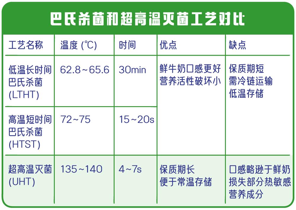 其实,按照国家规定,纯奶是不能添加任何防腐剂的。常温奶和鲜奶的主要区别在于杀菌方式不同。目前牛奶的杀菌方式及优缺点对比如图所示: