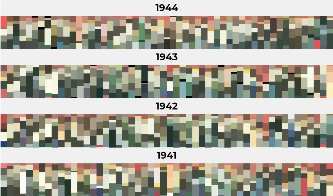 Nicholas Rougeux,“Color Palettes of The New Yorker: An analysis of the top colors used in the illustration on every issue’s cover since its debut in 1925.” March 26, 2017. https://c82.net/work/?id=359