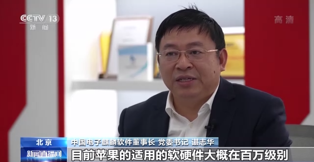 中国电子麒麟软件董事长、党委书记 谌志华:目前苹果的适用的软硬件大概在百万级别,微软(Windwos)在千万左右级别的,我们希望的话利用2-3年的时间,我们达到苹果目前(百万级别)的使用的生态水平。
