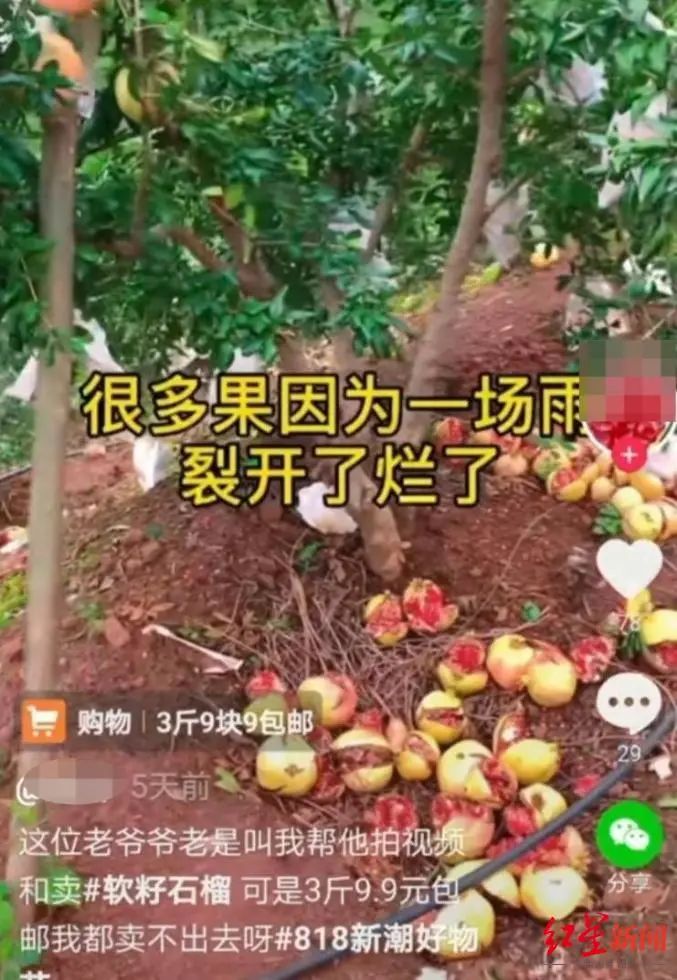 “几毛钱一斤都没人要。”今年8月,一些主播、网红在直播或者短视频中,声称会理石榴滞销、卖不出去。在一段短视频中,一名80多岁的老大爷头发花白,步履蹒跚地挑着两桶水,画面配文写道:“很多石榴都烂了,不如烂在地里当肥料了。”画面中,地上有一些裂开的石榴,同时配上了一段悲伤带着哭腔的声音。