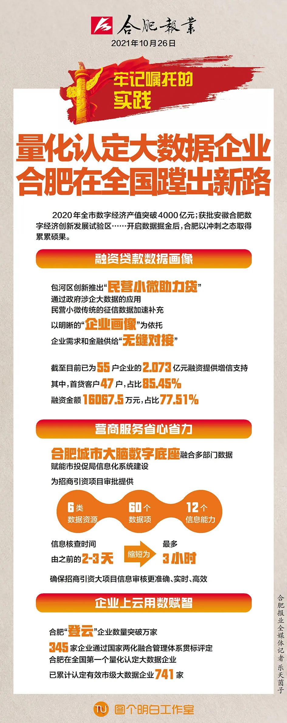 2020年全市数字经济产值突破4000亿元;获批安徽合肥数字经济创新发展试验区……开启数据掘金后,合肥以冲刺之态取得了累累硕果。10月26日,记者从合肥市数据资源局了解到,合肥在全国第一个量化认定大数据企业,已累计认定有效市级大数据企业741家。