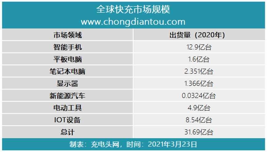 快充正是一个不错的选择。根据垂直网站充电头网,快充技术最早找到突破口的市场是手机,充电快带来的便利已经深入人心。从手机出发,逐步覆盖到了平板电脑、笔记本电脑、显示器、新能源汽车、电动工具、IoT设备等七大市场。通过对这七大市场的整体出货数据分析可见,智能手机占比最大,其次是IoT设备,每年这两个终端的数量总计超过了20亿台。