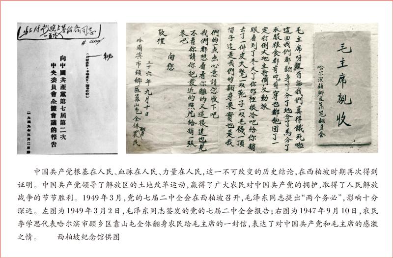 ——彰显为了人民、依靠人民的人民情怀。中国共产党根基在人民、血脉在人民、力量在人民。展览中展示了这样一封书信,信中写道:“毛主席呀,没有您我们真得饿死啦。这回我们都翻身了,分了地,分了马,分了衣服、粮食,都有吃有穿,也都抱团了……”这封信是东北翻身农民写给毛主席的,已经成为我们党一切为了人民、一切依靠人民的历史见证。全国土地会议景观、参加全国土地会议的部分人员名单、部分代表在土地会议上的发言稿、老农民在土墙上书写的《中国土地法大纲》照片、“土地回老家”锦旗……众多展品生动诠释了党在西柏坡的历史,就是全心全意为人民服务的历史。支前民工的立功喜报,用过的推车、纺线车,“运粮先锋”的奖旗……人民群众踊跃参军参战、缴粮支前,为人民军队提供了源源不断的人力物力,大大加快了解放战争胜利和新中国建立的步伐。党为了人民、依靠人民的文物、史料和真实记录,可以启迪干部群众深切感受到,党始终坚持全心全意为人民服务的根本宗旨,人民群众的拥护和支持是我们党最坚实的根基。