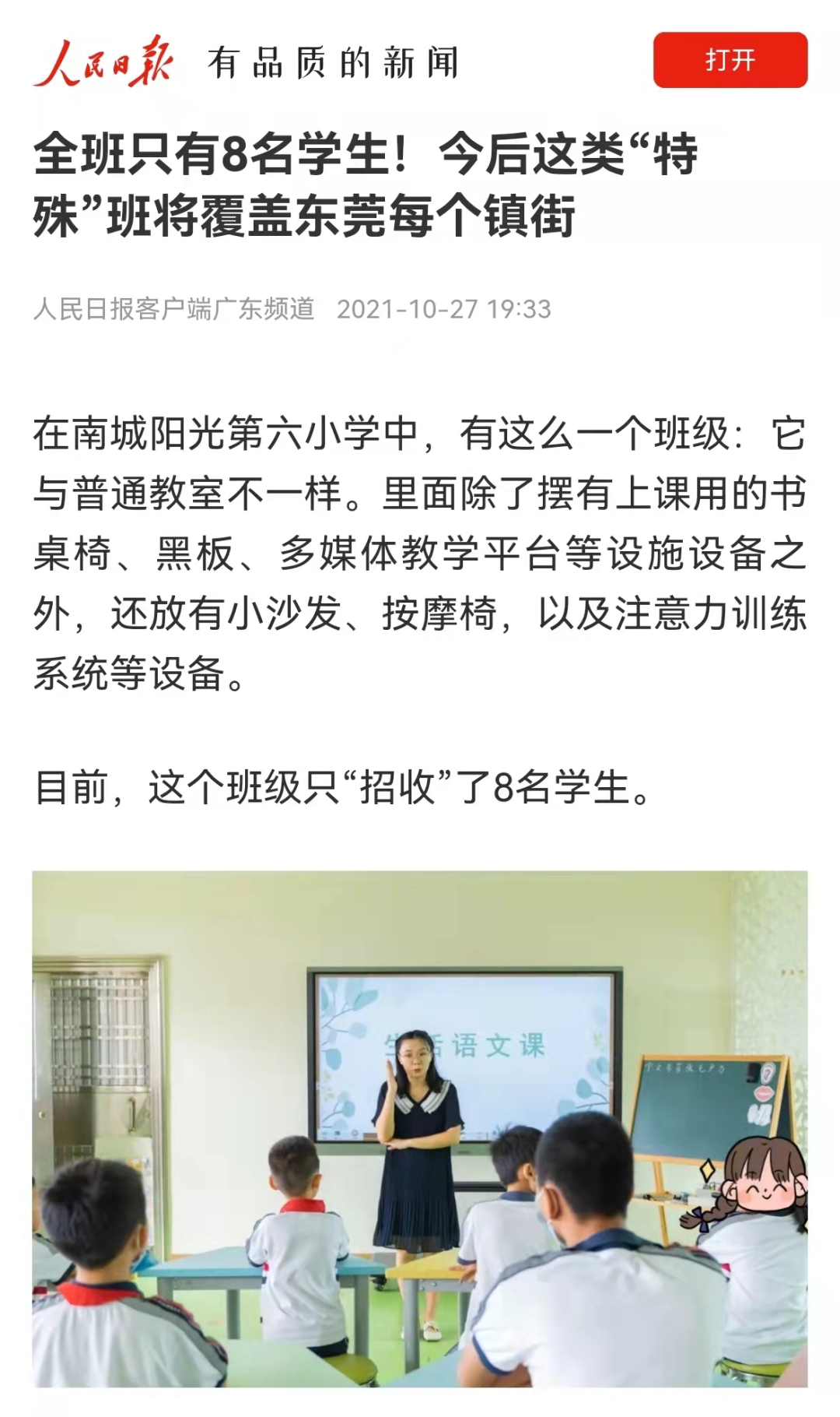 10月27日,人民日报客户端广东频道以《全班只有8名学生!今后这类“特殊”班将覆盖东莞每个镇街》为题,对东莞特殊教育进行了大篇幅报道。跟教育君一起来看看报道原文吧~