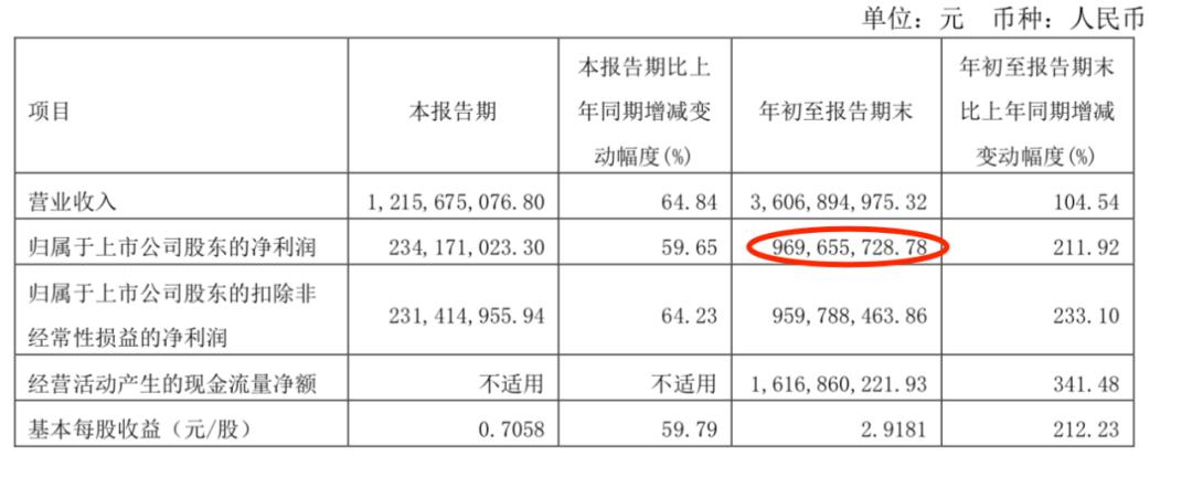 报告显示,今年前三季度,舍得实现营业收入36.07亿元,同比增长104.54%;归属上市公司股东的净利润9.7亿元,同比增长211.92%。