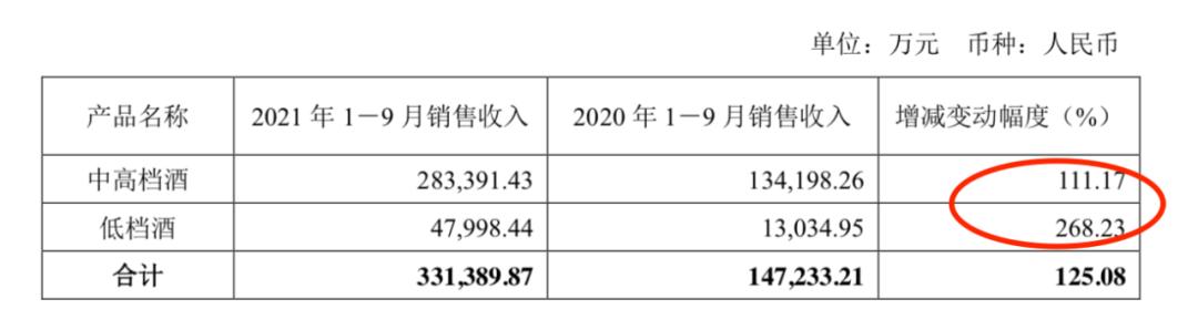 一是,中高档酒销售收入同比增速明显慢于低档酒。前者是111.17%,而后者达到了268.23%。