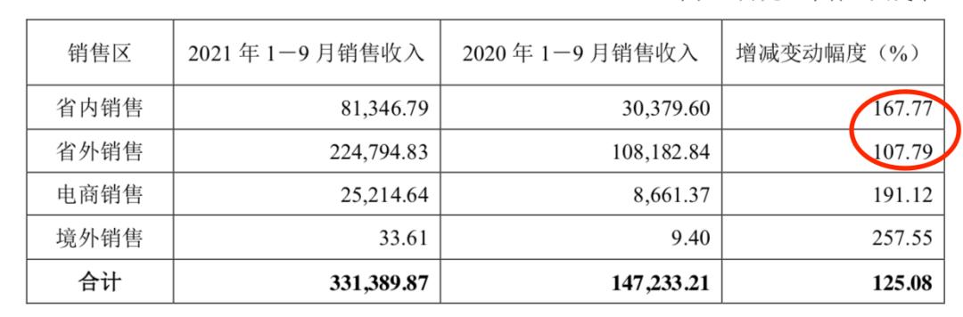 就今年前三季度的销售数据看,舍得的省外销售额已经远超省内销售,但省内销售额的增速依然远高于省外,前者达到167.77%,后者只有107.79%。