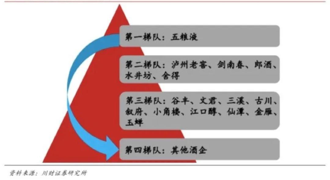 在川酒“六朵金花”中,五粮液处于第一梯队,其他的泸州老窖、剑南春、郎酒、水井坊、舍得为第二梯队。