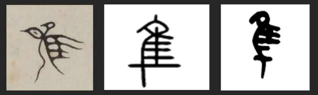 查鸟类学专著,隼形目包括所有的鹰类和隼类,隼科属中小型日行性猛禽。喙短而强壮带钩,身体呈锥状,两翼尖长,尾较长,为圆尾或楔尾。常栖息于林缘和开阔之境,飞行迅速有力。隼科中的游隼,在我国广泛分布,其腹部具有清晰的横纹,有时在空中巡猎,发现猎物后快速俯冲追击,甚至会伸出双脚“攥拳”击打猎物。还有一种红腿小隼,捕食前常有点头动作。这些特点都形象地反映在了鲁迅设计的图案里(下图依次为:鲁迅手绘“隼”;“隼”的金文小篆;“隼”的金文大篆):