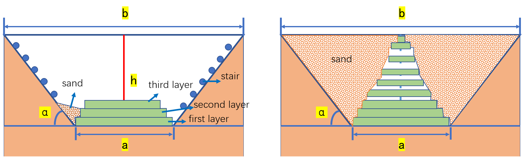 地坑修建方法解决了石块巨大重力提升的问题,但同时增加了挖坑这一工序。挖坑工程量直接由沙坑的体积决定,而沙坑体积一方面与金字塔的体积有关,另一方面与斜坡倾角(α)大小有关。α越小,斜坡越稳定,但挖坑工程量越大;α越大,工程量越小,但容易滑坡。沙坑体积(V)与斜坡倾角的正切(tan α)成线性关系,具体数学公式为: