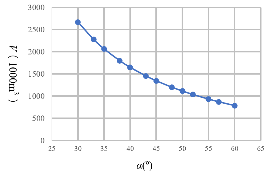 图5 辅助长坡道体积随斜坡倾角变化的关系