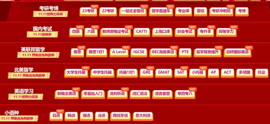 锌刻度注意到,目前新东方在线的官网上余下的课程分类主要为:考研考博、留学、四六级、小语种、职业证书、普通高校专升本等。而双十一在即,官网还推出了“抢神券”、“预售”、“定金膨胀”等活动,但销量大多都停留在两位数。其中2023考研直通车英语长线3期和政治长线3期,目前购买人数还停留在个位数。