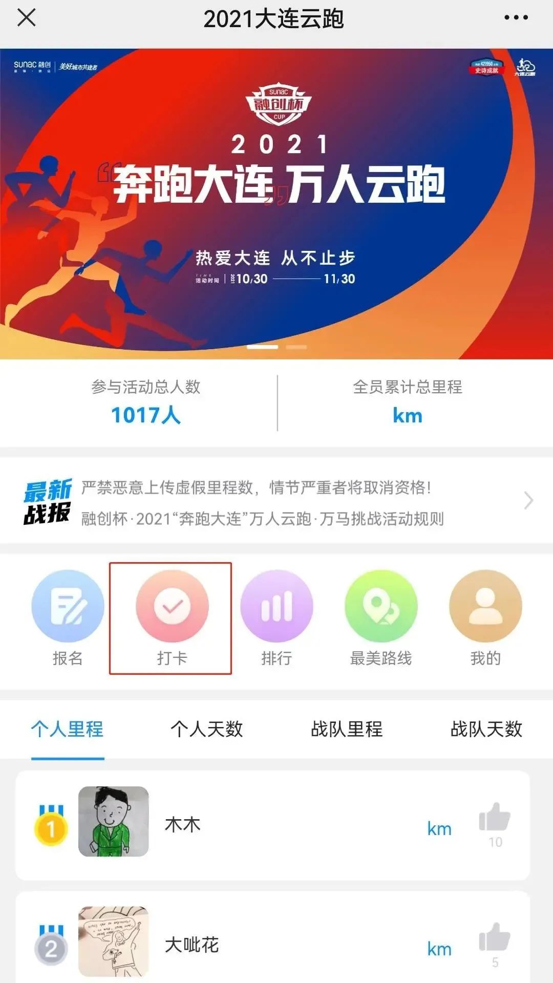 据了解,活动期间,报名者只需点击“大连云跑”官方小程序平台的“打卡”按钮,就可以上传当日的线下跑步成绩,从而在尽量减少聚集的情况下,通过“云跑”平台汇集跑步里程,凝聚城市活力。