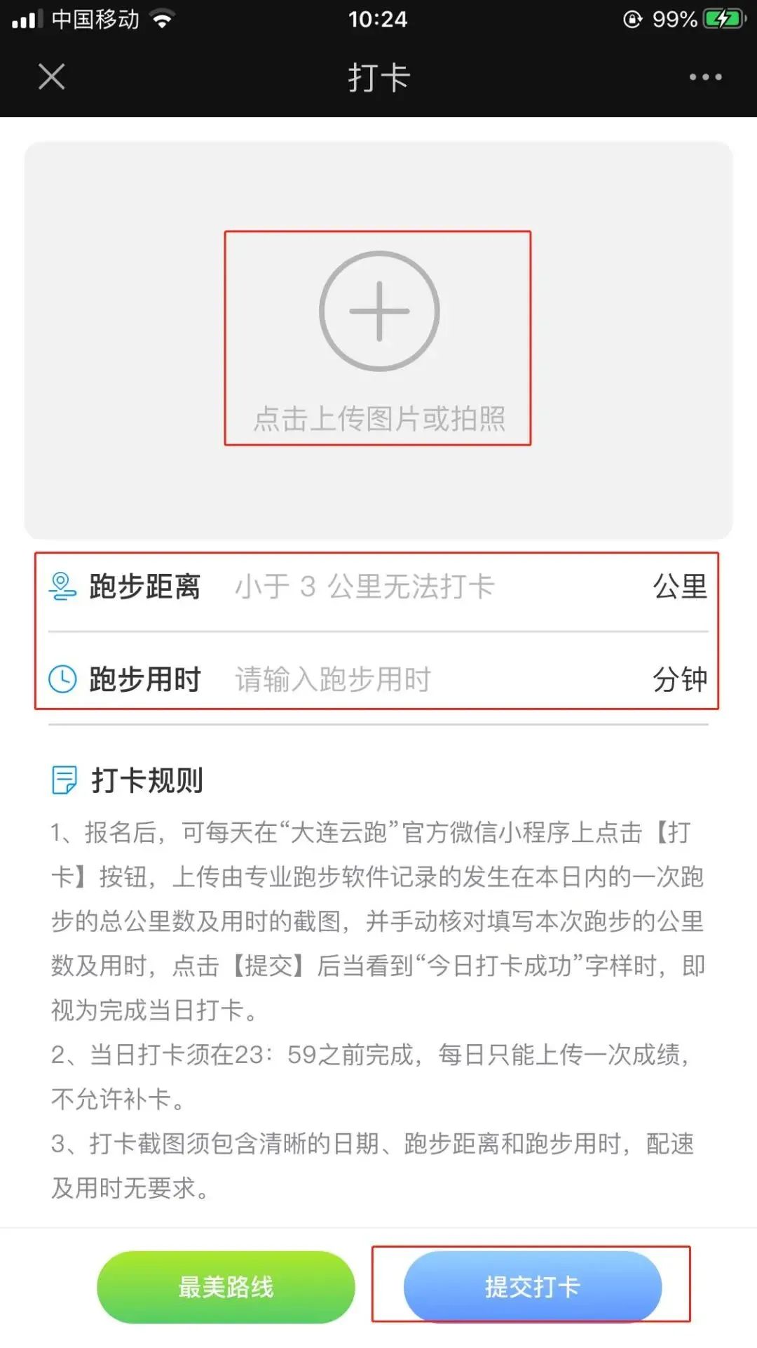 ● 参与者每次进行推荐路线打卡,须先在平台指定的10条推荐线路中,任选一条自己要打卡的路线名称,并一次性上传2张打卡图片:第1张为打卡者本人于本次活动时间内在该路线上进行跑步的计步软件记录截图(跑步距离最低为1公里,无配速要求);第2张为打卡者本人出镜的能够体现该条跑步路线实际环境的自拍照片。只有按规定正确上传以上2张照片,方可视为打卡该路线成功。