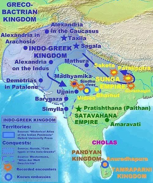 被斯基泰人毁灭的阿依哈图姆最后,在印度北部的希腊王权,继续着自己艰难的求生之路。他们一方面继续抵抗北方和西方的蛮族骑兵,一方面需要向南同印度人作战。著名的米南德一世就曾经成为希腊人的救世主和印度佛教徒的法王。长驱直入的希腊士兵,攻克了恒河流域的印度文明中心--华氏城。