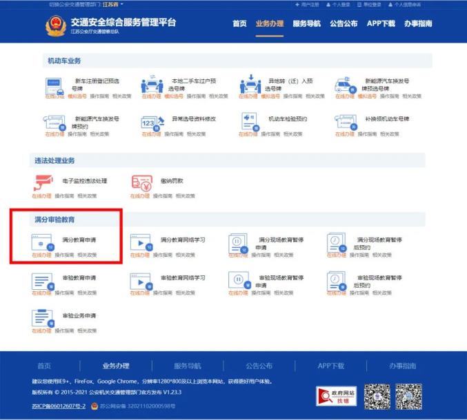 电脑登录“互联网交通安全综合服务管理平台”https://js.122.gov.cn/注册登录个人账号,在“业务办理”中选择“满分教育申请”,填写相关资料进行申请。