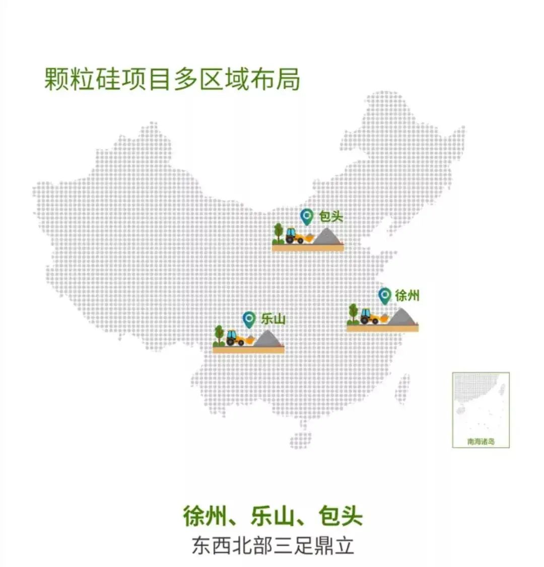 经梳理发现,目前,保利协鑫已规划在江苏徐州、四川乐山以及内蒙古包头建设三个十万吨级硅料项目,在国内形成东部、西部、北部 “三足鼎立”之势。
