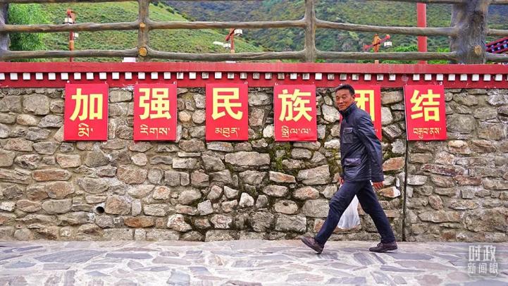 △西藏林芝嘎拉村村民走过“加强民族团结”标语墙。(总台国广记者李晋拍摄)总书记鲜明指出,铸牢中华民族共同体意识,就是要引导各族人民牢固树立休戚与共、荣辱与共、生死与共、命运与共的共同体理念。
