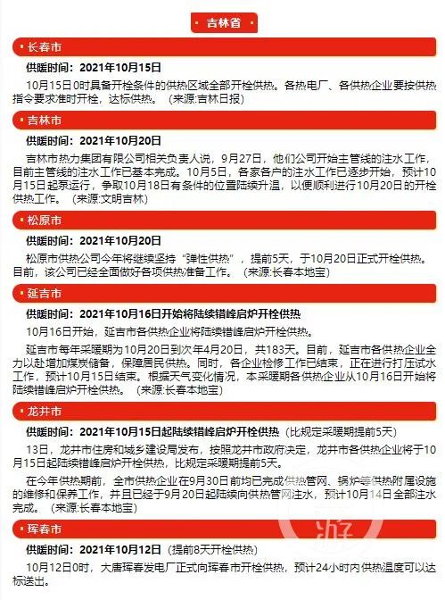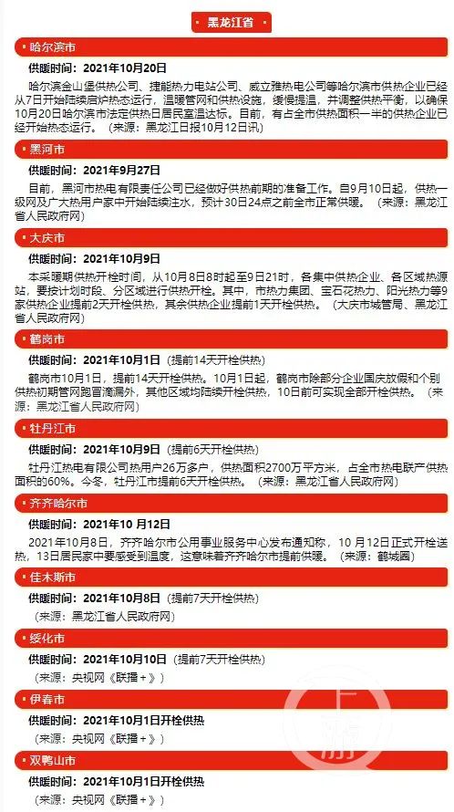 吉林省部分城市供热时间表。/综合此外,黑龙江省作为我国最北的省份,与其他省份相比入冬早、温度低。气象信息显示,近期大兴安岭地区最低温度已达-16℃左右。