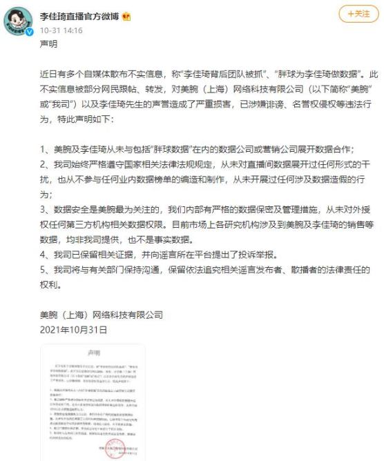 声明指出,美腕及李佳琦从未与包括“胖球数据”在内的数据公司或营销公司展开数据合作;美腕始终严格遵守国家相关法律法规规定,从未对直播间数据展开过任何形式的干扰,也从不参与任何业内数据榜单的编造和制作,从未开展过任何涉及数据造假的行为;数据安全是美腕最为关注的,公司内部有严格的数据保密及管理措施,从未对外授权任何第三方机构相关数据权限。