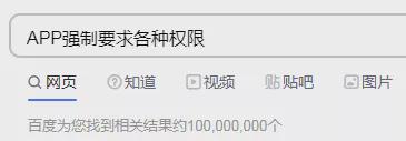 在百度搜索框输入“APP权限”,记者发现“APP强制要求各种权限”“APP要电话权限安全吗”“手机软件APP需要这么多权限?”等各种搜索问题。其中,“APP强制要求各种权限”的相关结果约1亿个,“APP要电话权限安全吗”的搜索结果量也超过4400万个。