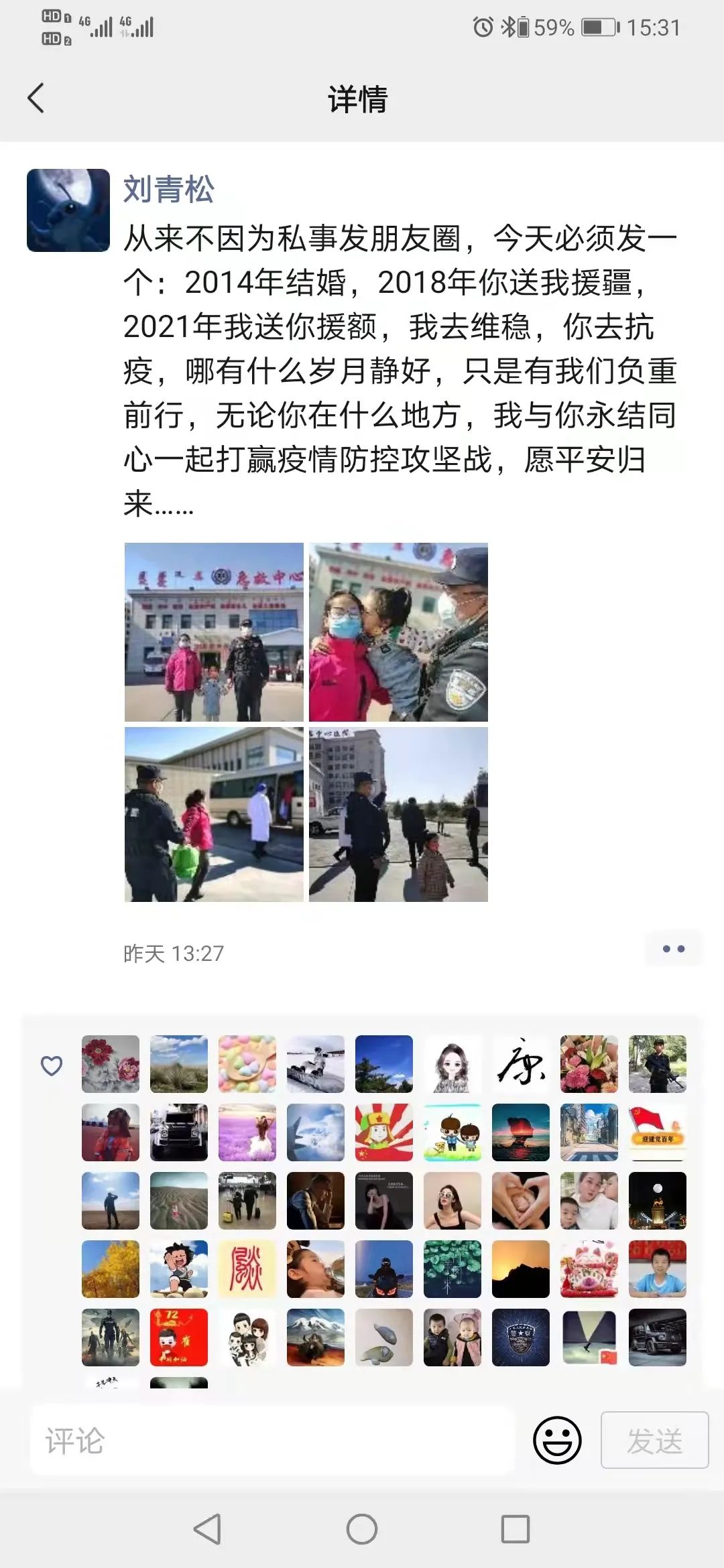 10月31日,“发个朋友圈吧,这几年从来不因为私事发朋友圈,今天必须发一个:2014年结婚,2018年你送我去援疆,2021年我送你去援额。我去维稳,你去抗疫,哪有什么岁月静好,只是有我们负重前行。无论你在什么地方,我与你永结同心一起打赢疫情防控攻坚战,愿平安归来……”发完朋友圈,刘青松感觉轻松多了。