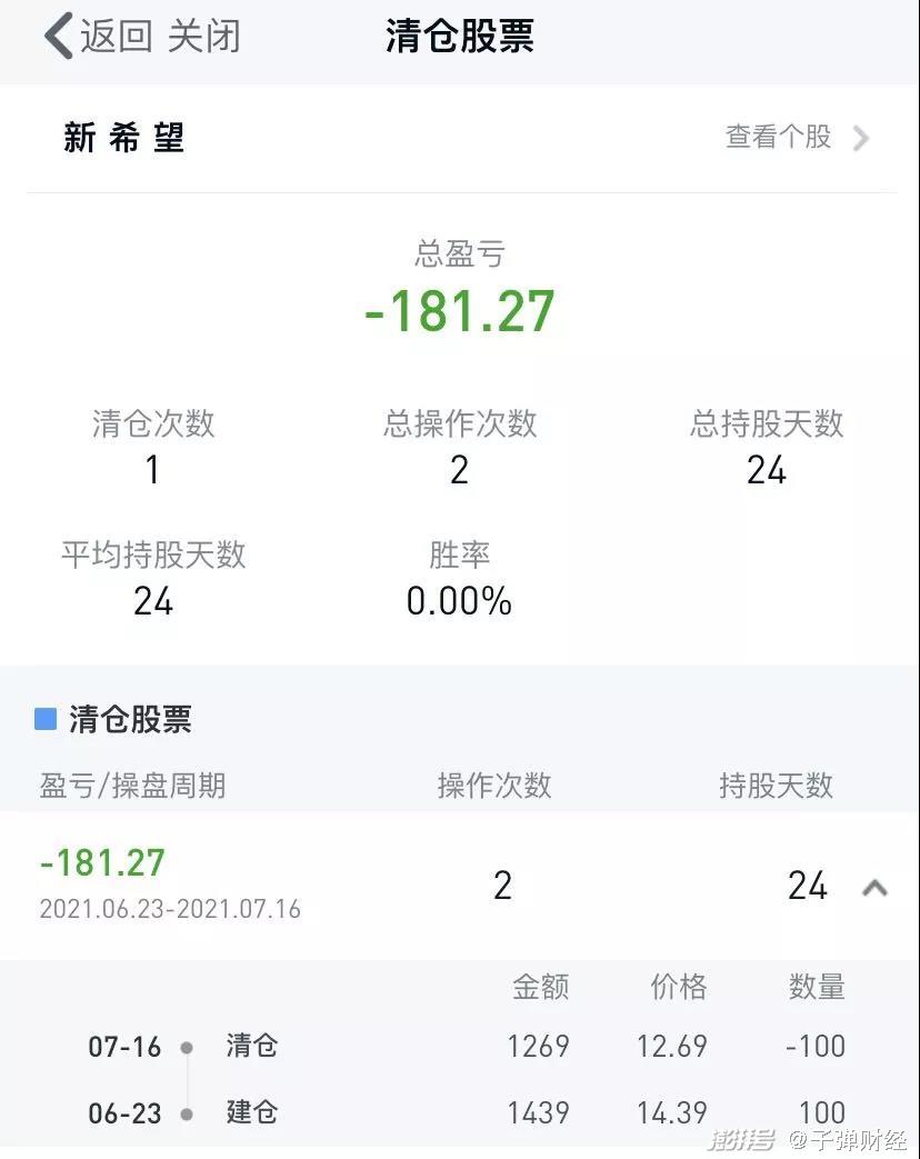 但她买完新希望后,观察了20多天,发现这个股票不大涨也不大跌,“就是死气沉沉的,我也没啥加仓的想法和机会,但我实在是没耐心等,感觉还是买新能源等比较热点的板块刺激,就亏一百多块钱清仓了。再看现在新希望的股价,我觉得当时没加仓而是选择清仓特别明智,这种股票可能还是适合炒长线的买。”