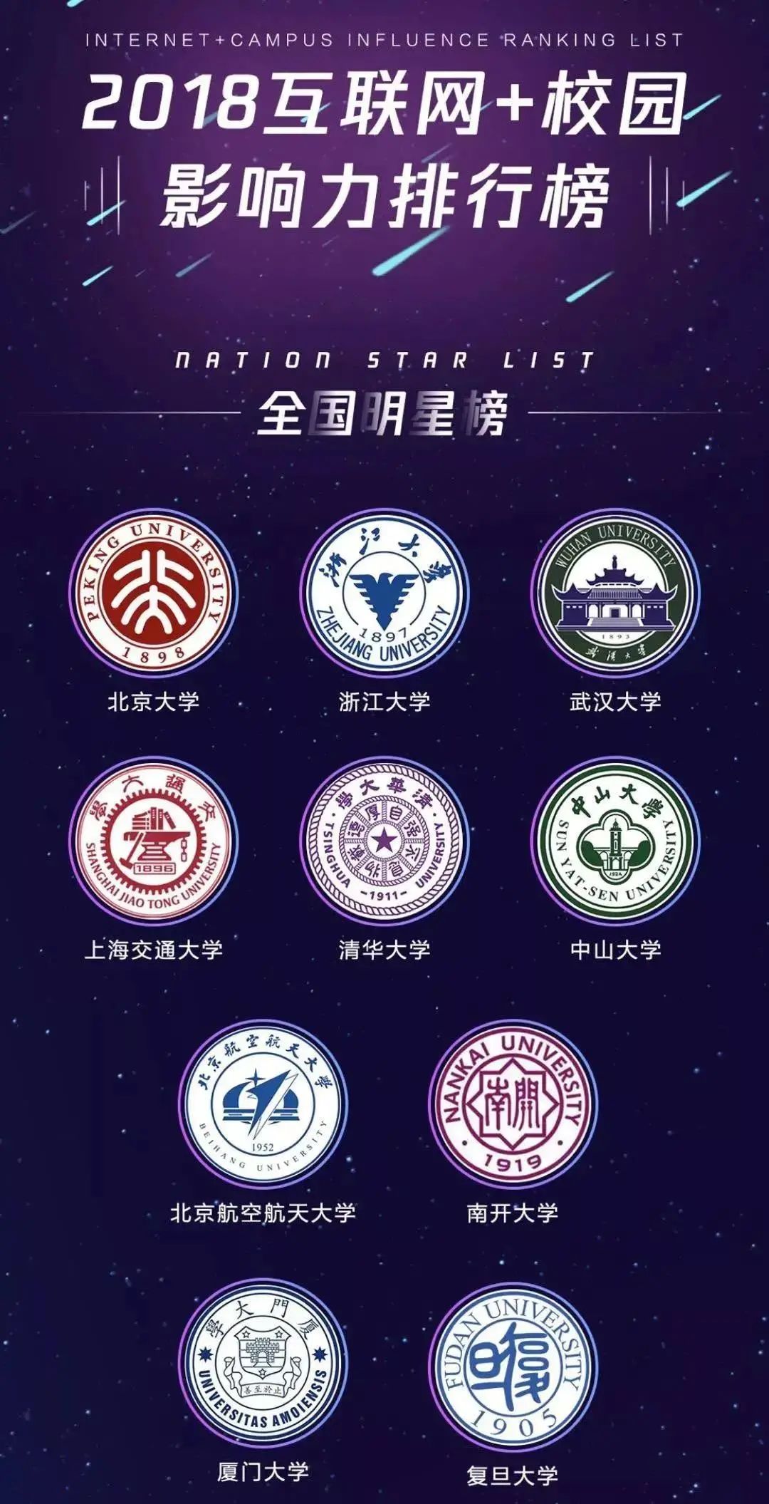 2019年,腾讯微校公布2018年互联网+校园影响力排行榜,北航官微登上“全国明星榜”(十强)。
