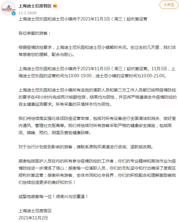 上海迪士尼度假区2日发布通告:上海迪士尼乐园和迪士尼小镇将于2021年11月3日(周三)起恢复运营。