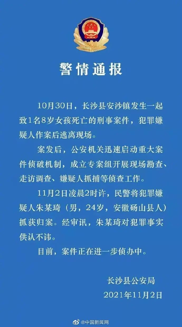 11月2日,湖南长沙县警方通报,10月30日,长沙县安沙镇发生一起致1名8岁女孩死亡的刑事案件。11月2日凌晨2时许,民警将犯罪嫌疑人朱某琦(男,24岁,安徽砀山县人)抓获归案。目前,案件正在进一步侦办中。