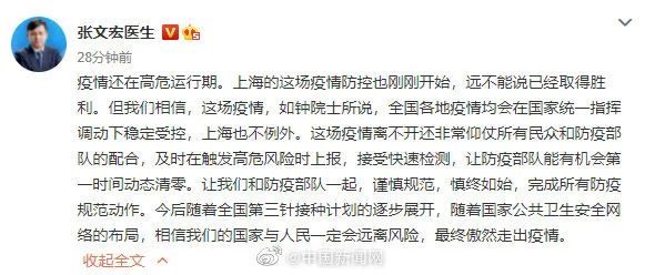 2日,@张文宏医生 发文表示:疫情还在高危运行期。上海的这场疫情防控也刚刚开始,远不能说已经取得胜利。但我们相信,这场疫情,如钟院士所说,全国各地疫情均会在国家统一指挥调动下稳定受控,上海也不例外。这场疫情离不开还非常仰仗所有民众和防疫部队的配合,及时在触发高危风险时上报,接受快速检测,让防疫部队能有机会第一时间动态清零。让我们和防疫部队一起,谨慎规范,慎终如始,完成所有防疫规范动作。今后随着全国第三针接种计划的逐步展开,随着国家公共卫生安全网络的布局,相信我们的国家与人民一定会远离风险,最终傲然走出疫情。