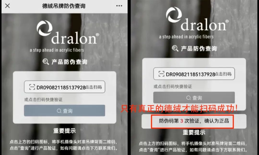 正品德绒吊牌,可扫码验证材料真不真?更简单方法就是看吊牌!