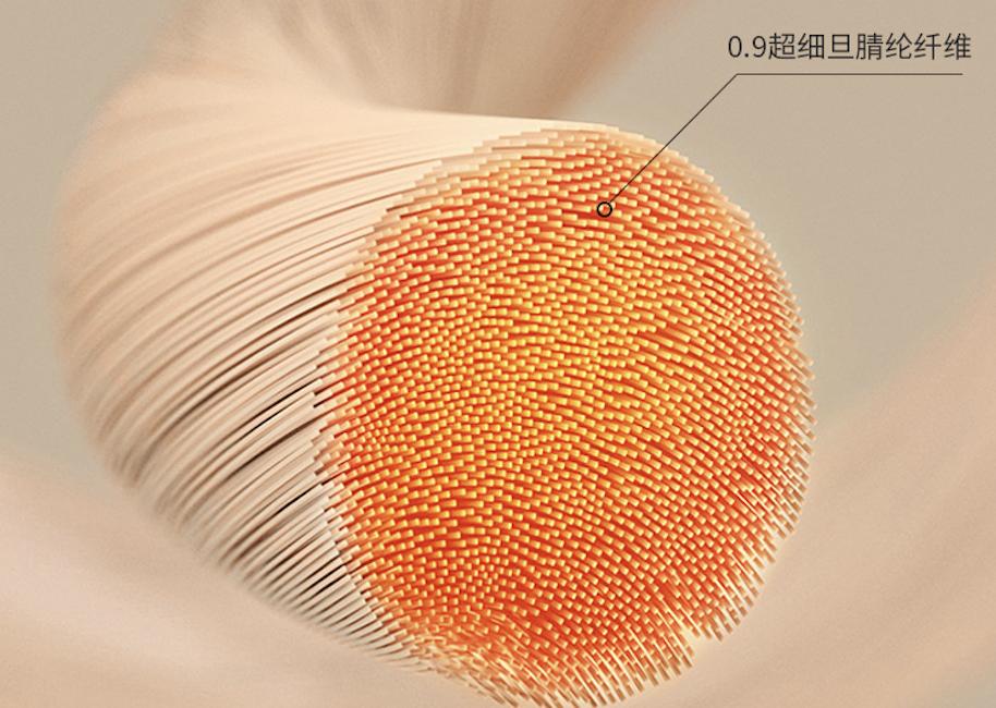 「旦」指纤维9000米长的克重,0.9旦即一根9000米长的德绒纤维仅0.9克重。旦数越小,纤维越细,而纤维越细,织成的面料越蓬松柔软。