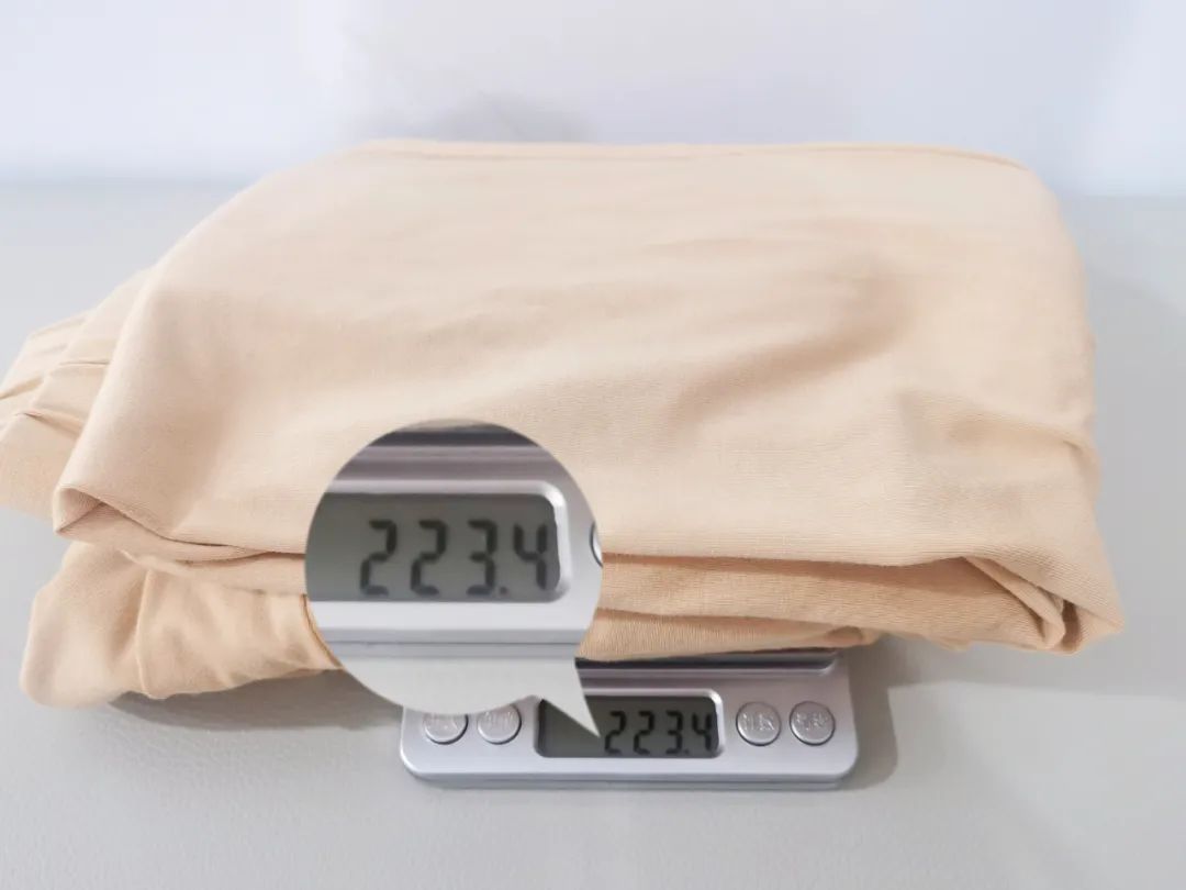 左:德绒保暖内衣 右:其他品牌的保暖内衣拿去一称,竟然只有223g左右,不到半瓶矿泉水重量,可以想像穿上有多轻松舒服,完全不会臃肿。